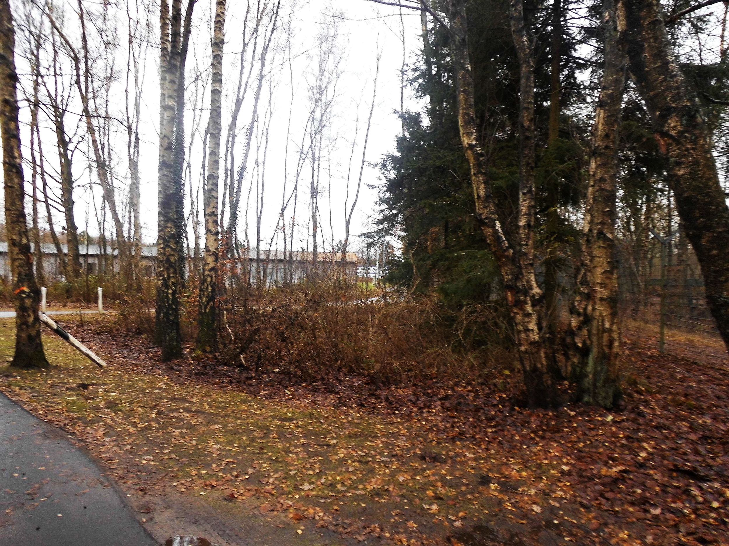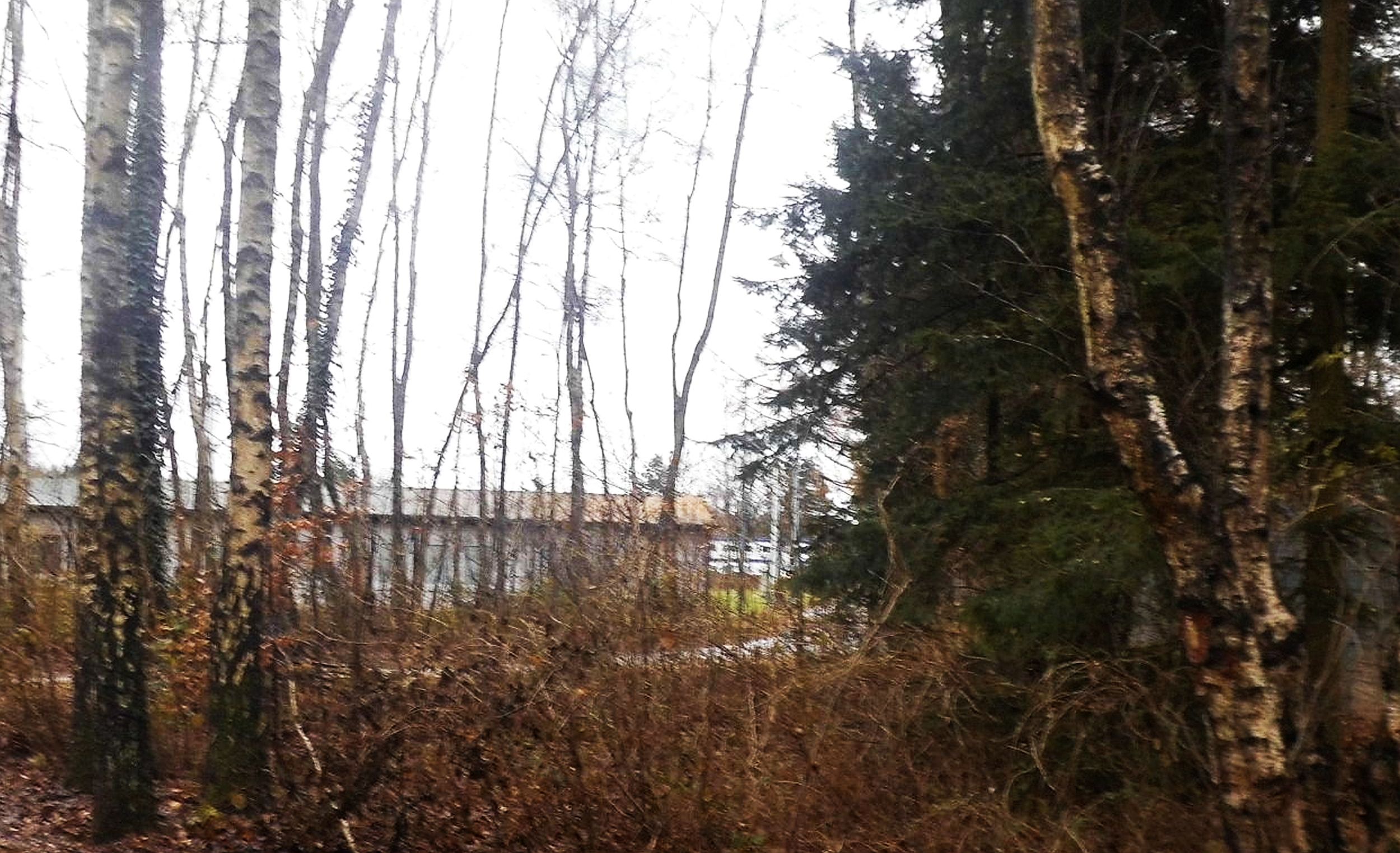 Through trees and underbrush, behind another fence wrapped in barbed wire you can see white-blue containers. Alright, this is what they mean with “where”: the massive iron-gate, through which you can only just guess the silhouettes of three or four people in the drizzle. Behind a fence “secured” with barbed wire.